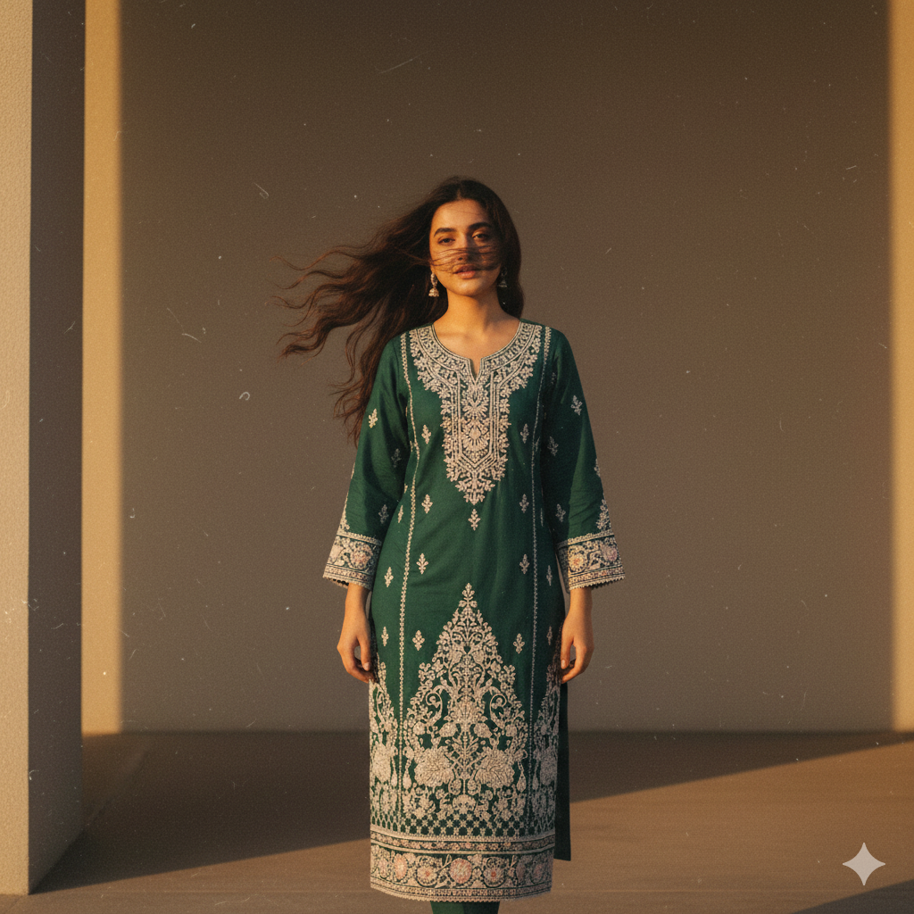 Embrace refined tradition with this exquisite embroidered suit from Rang-E-Gulzar, designed to bring together comfort, style, and cultural charm. Featuring detailed embroidery on the neckline, sleeves, and front panel, this outfit radiates sophistication without compromising on comfort.